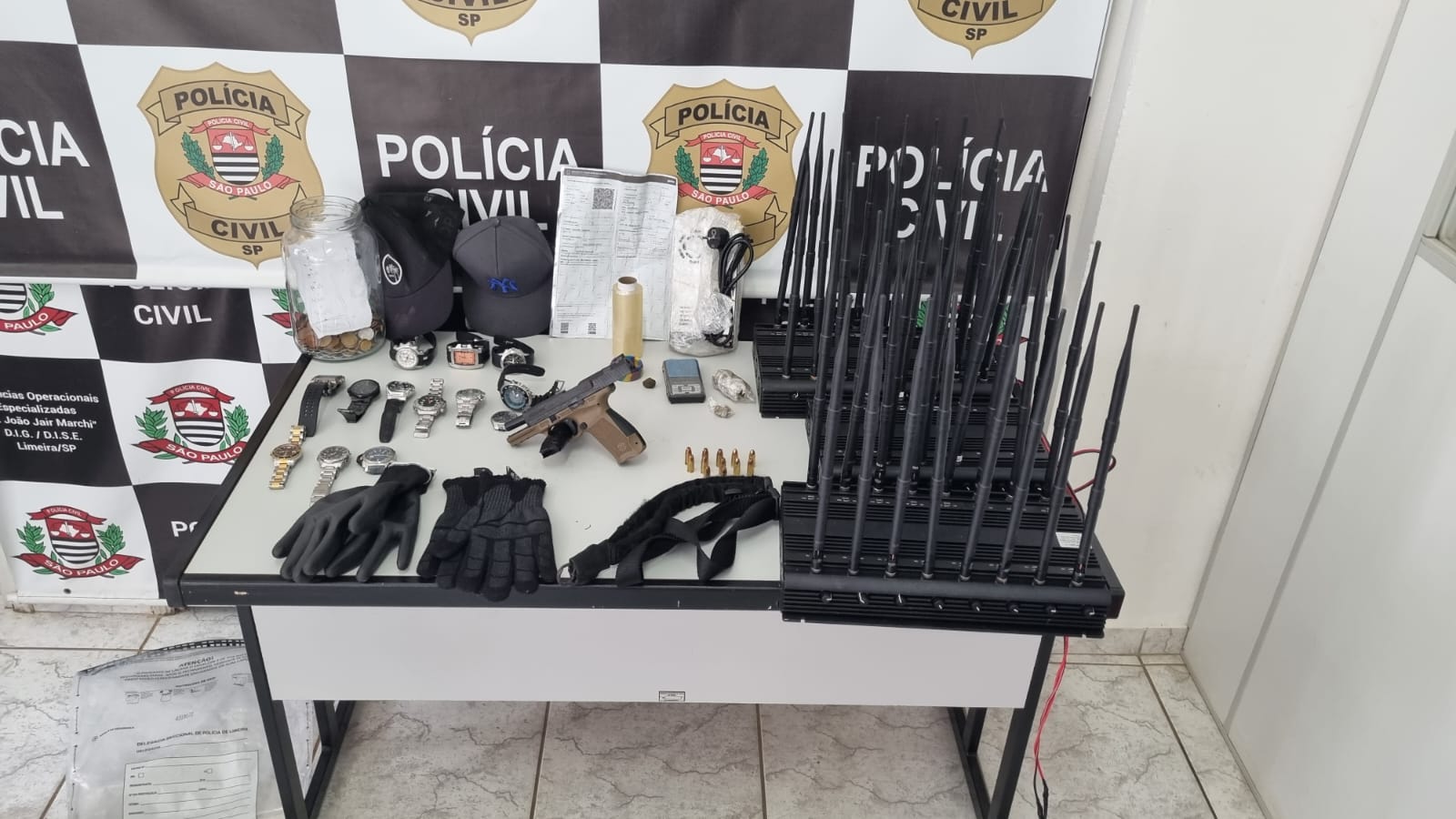Os mandados de busca e apreensão foram cumpridos nas cidades de Carapicuíba, Campinas, Guarujá, São Roque e São Paulo. Quatro pistolas, quatro bloqueadores de sinais, três placas de veículo, além de munições, celulares, maconha, haxixe, cigarros eletrônicos e outros itens foram apreendidos na operação.