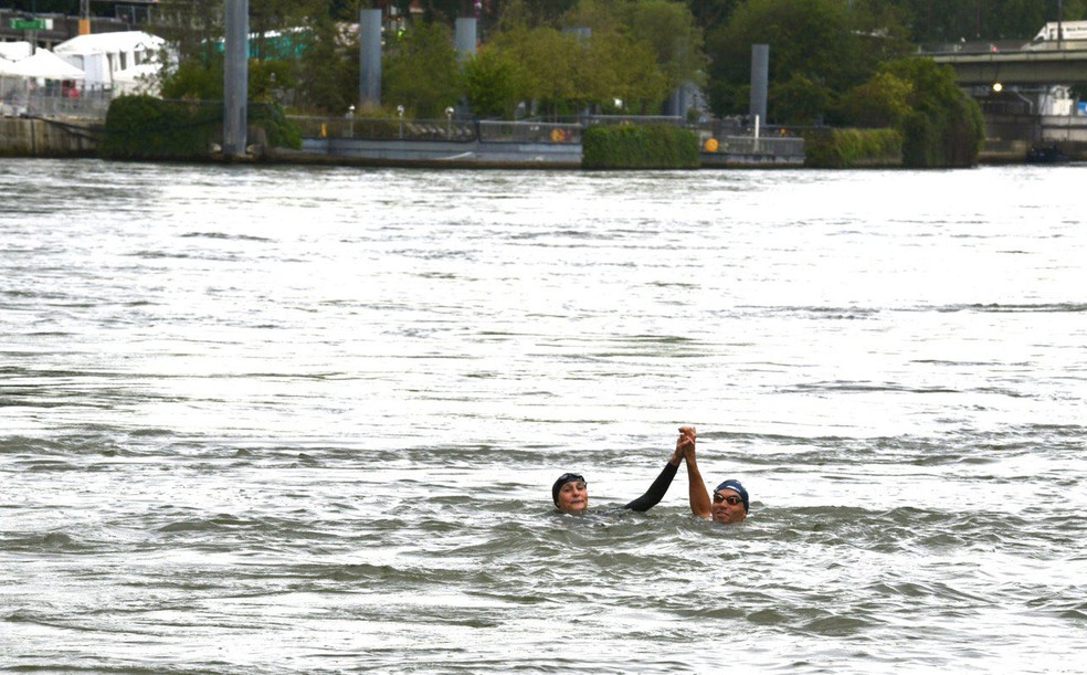 Acompanhada do triatleta paralímpico Alexis Hanquinquant, a ministra mergulhou próximo à ponte des Invalides, local das provas de maratona aquática e triatlo.