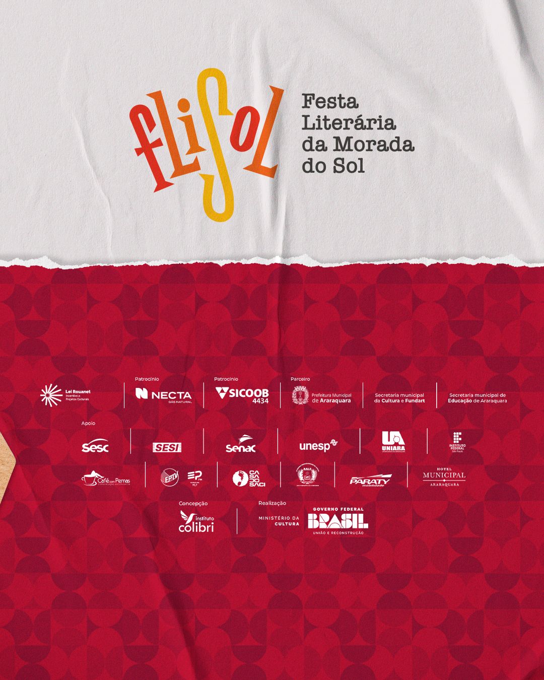 Com parceiros e apoiadores como Sesc, Senac, Sesi, Unesp, Uniara, Instituto Federal de São Paulo, Academia Araraquarense de Letras, Hotel Municipal, Paraty Mobilidade, Casa do Saci, Café com Pernas, EPTV e EP FM, a FliSol chega este ano a sua 4ª edição e reforça seu papel como uma das principais plataformas culturais do interior paulista. O evento conta ainda com patrocínio da Necta e do Sicoob Araraquara.
